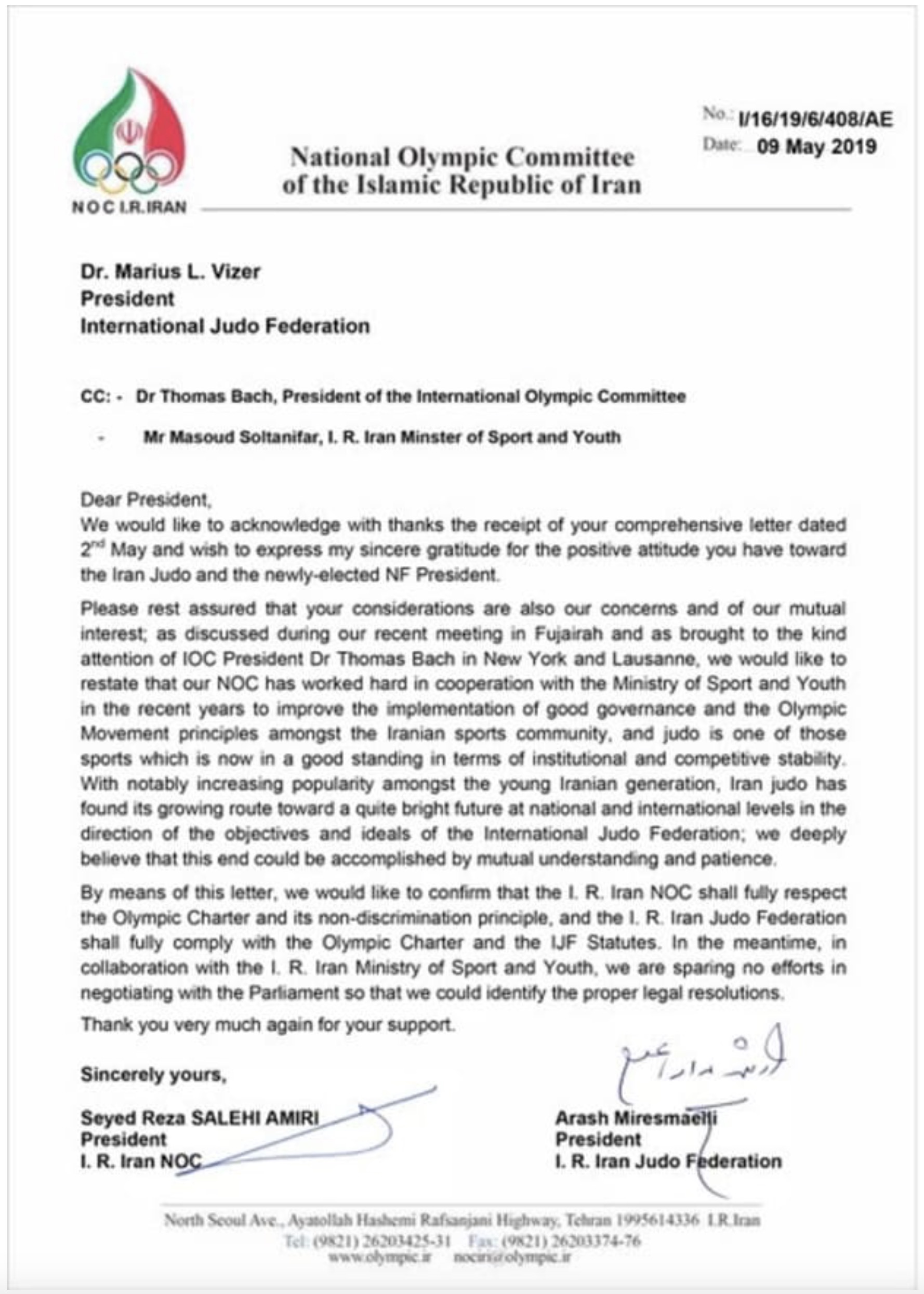 Une réponse adressée le 8 mai est publiée sur le site de la FIJ. Elle est signée par le président du Comité olympique iranien et par Arash Miresmaeili, le président récemment élu de la Fédération iranienne de judo dont on sait qu’il a à la fois souffert et bénéficié de circonstances similaires.